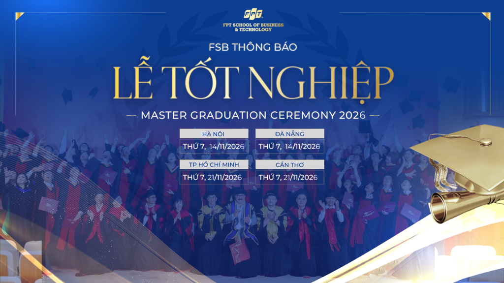 Viện Quản trị & Công nghệ FSB, Trường Đại học FPT trân trọng thông báo kế hoạch tổ chức Lễ Tốt nghiệp Thạc sĩ năm 2026 dành cho các học viên đã tốt nghiệp chương trình đào tạo: Thạc sĩ Quản trị Kinh doanh (MBA), Thạc sĩ Kỹ thuật Phần mềm (MSE) và chương trình Thạc sĩ Quản trị Kinh doanh liên kết với Đại học Leeds Beckett, Vương quốc Anh (LBM).