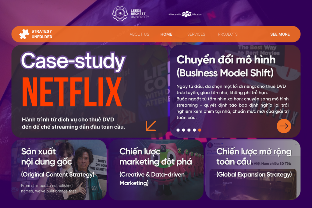 Netflix là case-study tiêu biểu trong chương trình học của Leeds Beckett MBA. Học viên được phân tích từ mô hình kinh doanh, chiến lược đổi mới, quản trị rủi ro đến tư duy lãnh đạo trong bối cảnh chuyển đổi số, đây là nền tảng quan trọng để trở thành những nhà quản trị hiện đại.